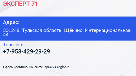ЭКСПЕРТ 71 по адресу 301248, Тульская область, Щёкино, Интернациональная, 44 в дальнейшем Организация, размещена в следующих категориях: