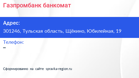 Газпромбанк, банкомат по адресу 301246, Тульская область, Щёкино, Юбилейная, 19 в дальнейшем Организация, размещена в следующих категориях: