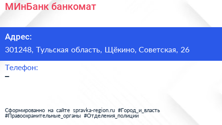 МИнБанк, банкомат по адресу 301248, Тульская область, Щёкино, Советская, 26 в дальнейшем Организация, размещена в следующих категориях: