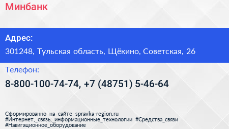 Минбанк по адресу 301248, Тульская область, Щёкино, Советская, 26 в дальнейшем Организация, размещена в следующих категориях: