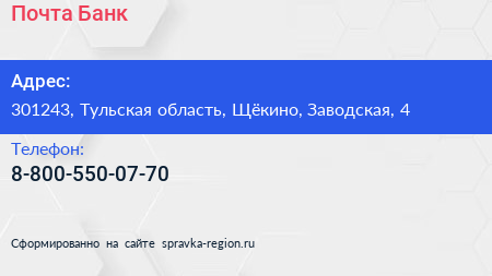 Почта Банк по адресу 301243, Тульская область, Щёкино, Заводская, 4 в дальнейшем Организация, размещена в следующих категориях: