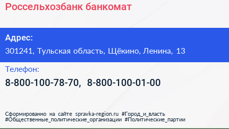 Россельхозбанк, банкомат по адресу 301241, Тульская область, Щёкино, Ленина, 13 в дальнейшем Организация, размещена в следующих категориях: