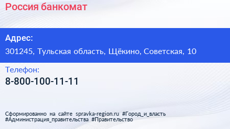Россия, банкомат по адресу 301245, Тульская область, Щёкино, Советская, 10 в дальнейшем Организация, размещена в следующих категориях: