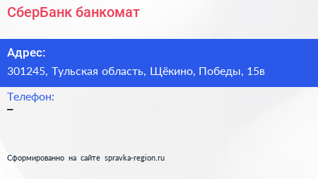 СберБанк, банкомат по адресу 301245, Тульская область, Щёкино, Победы, 15в в дальнейшем Организация, размещена в следующих категориях: