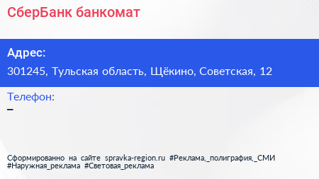 СберБанк, банкомат по адресу 301245, Тульская область, Щёкино, Советская, 12 в дальнейшем Организация, размещена в следующих категориях: