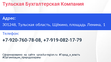Тульская Бухгалтерская Компания по адресу 301248, Тульская область, Щёкино, площадь Ленина, 1 в дальнейшем Организация, размещена в следующих категориях: