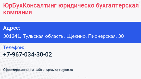 ЮрБухКонсалтинг, юридическо-бухгалтерская компания по адресу 301241, Тульская область, Щёкино, Пионерская, 30 в дальнейшем Организация, размещена в следующих категориях: