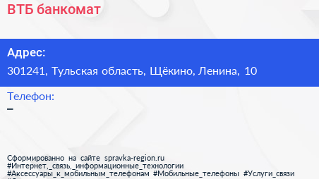 ВТБ, банкомат по адресу 301241, Тульская область, Щёкино, Ленина, 10 в дальнейшем Организация, размещена в следующих категориях: