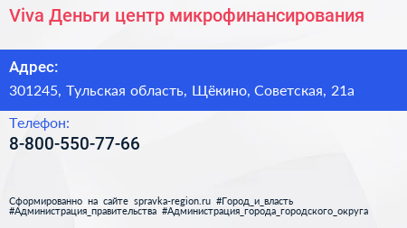 Viva Деньги, центр микрофинансирования по адресу 301245, Тульская область, Щёкино, Советская, 21а в дальнейшем Организация, размещена в следующих категориях: