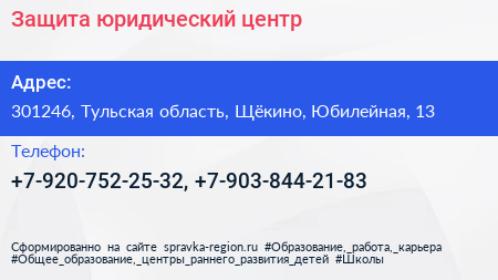 Защита, юридический центр по адресу 301246, Тульская область, Щёкино, Юбилейная, 13 в дальнейшем Организация, размещена в следующих категориях: