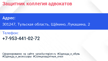 Защитник, коллегия адвокатов по адресу 301247, Тульская область, Щёкино, Лукашина, 2 в дальнейшем Организация, размещена в следующих категориях: