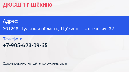 ДЮСШ №1, г. Щёкино по адресу 301248, Тульская область, Щёкино, Шахтёрская, 32 в дальнейшем Организация, размещена в следующих категориях: