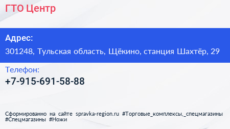 ГТО Центр по адресу 301248, Тульская область, Щёкино, станция Шахтёр, 29 в дальнейшем Организация, размещена в следующих категориях: