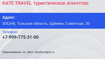 KATE TRAVEL, туристическое агентство по адресу 301248, Тульская область, Щёкино, Советская, 20 в дальнейшем Организация, размещена в следующих категориях: