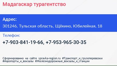 Мадагаскар, турагентство по адресу 301246, Тульская область, Щёкино, Юбилейная, 18 в дальнейшем Организация, размещена в следующих категориях:
