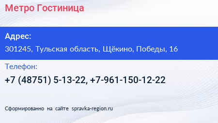 Метро, Гостиница по адресу 301245, Тульская область, Щёкино, Победы, 16 в дальнейшем Организация, размещена в следующих категориях: