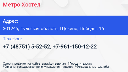 Метро, Хостел по адресу 301245, Тульская область, Щёкино, Победы, 16 в дальнейшем Организация, размещена в следующих категориях: