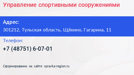Управление спортивными сооружениями по адресу 301212, Тульская область, Щёкино, Гагарина, 11 в дальнейшем Организация, размещена в следующих категориях: