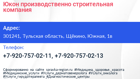 Юкон, производственно-строительная компания по адресу 301241, Тульская область, Щёкино, Южная, 1в в дальнейшем Организация, размещена в следующих категориях: