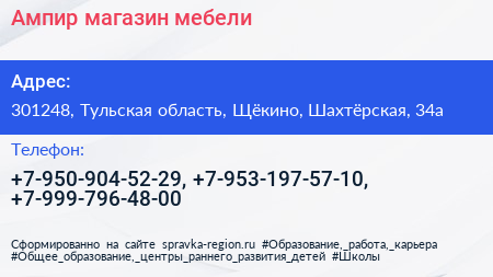 Ампир, магазин мебели по адресу 301248, Тульская область, Щёкино, Шахтёрская, 34а в дальнейшем Организация, размещена в следующих категориях: