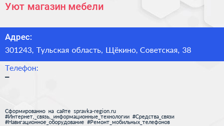 Уют, магазин мебели по адресу 301243, Тульская область, Щёкино, Советская, 38 в дальнейшем Организация, размещена в следующих категориях: