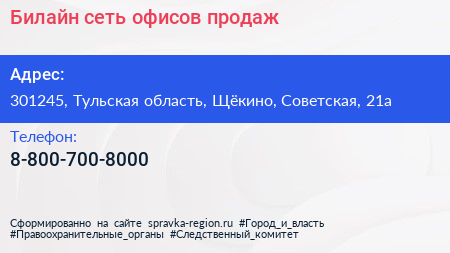 Билайн, сеть офисов продаж по адресу 301245, Тульская область, Щёкино, Советская, 21а в дальнейшем Организация, размещена в следующих категориях: