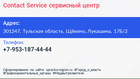 Contact Service, сервисный центр по адресу 301247, Тульская область, Щёкино, Лукашина, 17Б/2 в дальнейшем Организация, размещена в следующих категориях: