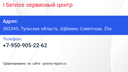 I-Service, сервисный центр по адресу 301245, Тульская область, Щёкино, Советская, 25а в дальнейшем Организация, размещена в следующих категориях: