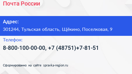 Почта России по адресу 301244, Тульская область, Щёкино, Поселковая, 9 в дальнейшем Организация, размещена в следующих категориях: