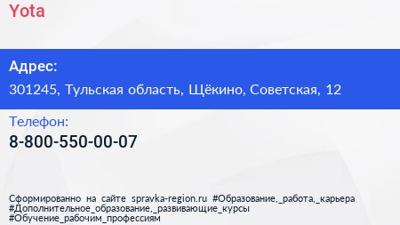 Yota по адресу 301245, Тульская область, Щёкино, Советская, 12 в дальнейшем Организация, размещена в следующих категориях: