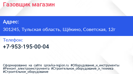 Газовщик, магазин по адресу 301245, Тульская область, Щёкино, Советская, 12г в дальнейшем Организация, размещена в следующих категориях: