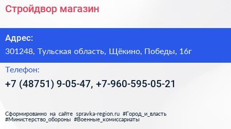 Стройдвор, магазин по адресу 301248, Тульская область, Щёкино, Победы, 16г в дальнейшем Организация, размещена в следующих категориях: