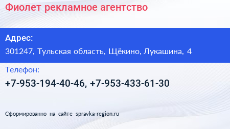 Фиолет, рекламное агентство по адресу 301247, Тульская область, Щёкино, Лукашина, 4 в дальнейшем Организация, размещена в следующих категориях: