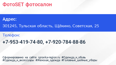 ФотоSET, фотосалон по адресу 301245, Тульская область, Щёкино, Советская, 25 в дальнейшем Организация, размещена в следующих категориях: