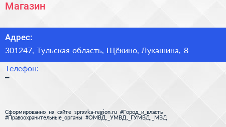 Магазин по адресу 301247, Тульская область, Щёкино, Лукашина, 8 в дальнейшем Организация, размещена в следующих категориях: