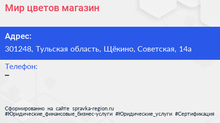 Мир цветов, магазин по адресу 301248, Тульская область, Щёкино, Советская, 14а в дальнейшем Организация, размещена в следующих категориях: