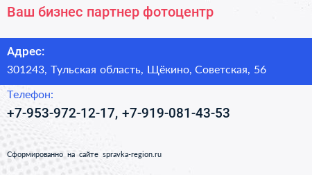 Ваш бизнес-партнер, фотоцентр по адресу 301243, Тульская область, Щёкино, Советская, 56 в дальнейшем Организация, размещена в следующих категориях: