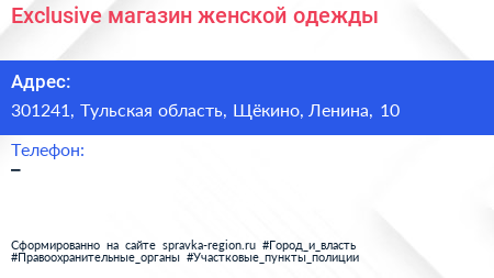 Exclusive, магазин женской одежды по адресу 301241, Тульская область, Щёкино, Ленина, 10 в дальнейшем Организация, размещена в следующих категориях: