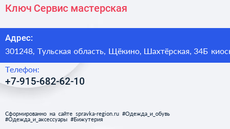 Ключ-Сервис, мастерская по адресу 301248, Тульская область, Щёкино, Шахтёрская, 34Б киоск в дальнейшем Организация, размещена в следующих категориях: