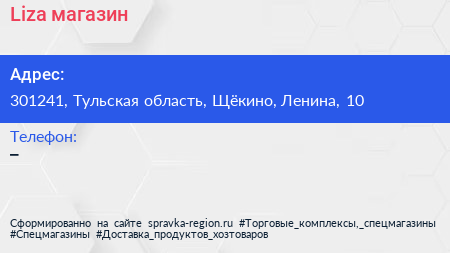 Liza, магазин по адресу 301241, Тульская область, Щёкино, Ленина, 10 в дальнейшем Организация, размещена в следующих категориях:
