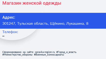 Магазин женской одежды по адресу 301247, Тульская область, Щёкино, Лукашина, 8 в дальнейшем Организация, размещена в следующих категориях: