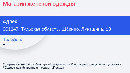 Магазин женской одежды по адресу 301247, Тульская область, Щёкино, Лукашина, 13 в дальнейшем Организация, размещена в следующих категориях: