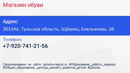 Магазин обуви по адресу 301246, Тульская область, Щёкино, Емельянова, 28 в дальнейшем Организация, размещена в следующих категориях:
