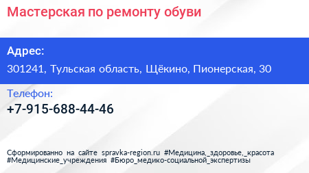 Мастерская по ремонту обуви по адресу 301241, Тульская область, Щёкино, Пионерская, 30 в дальнейшем Организация, размещена в следующих категориях: