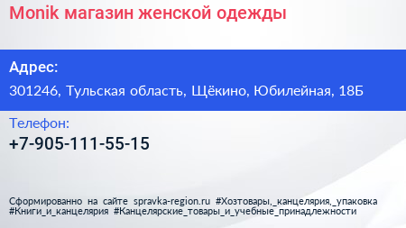 Monik, магазин женской одежды по адресу 301246, Тульская область, Щёкино, Юбилейная, 18Б в дальнейшем Организация, размещена в следующих категориях:
