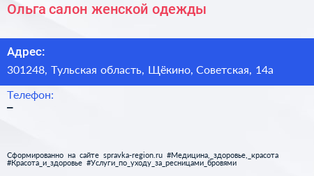 Ольга, салон женской одежды по адресу 301248, Тульская область, Щёкино, Советская, 14а в дальнейшем Организация, размещена в следующих категориях: