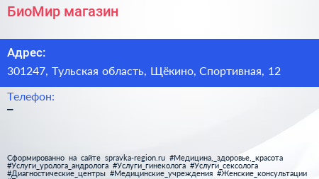 БиоМир, магазин по адресу 301247, Тульская область, Щёкино, Спортивная, 12 в дальнейшем Организация, размещена в следующих категориях: