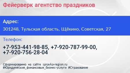 Фейерверк, агентство праздников по адресу 301248, Тульская область, Щёкино, Советская, 27 в дальнейшем Организация, размещена в следующих категориях: