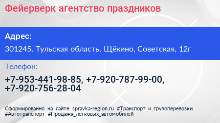 Фейерверк, агентство праздников по адресу 301245, Тульская область, Щёкино, Советская, 12г в дальнейшем Организация, размещена в следующих категориях: