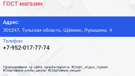 ГОСТ, магазин по адресу 301247, Тульская область, Щёкино, Лукашина, 4 в дальнейшем Организация, размещена в следующих категориях: